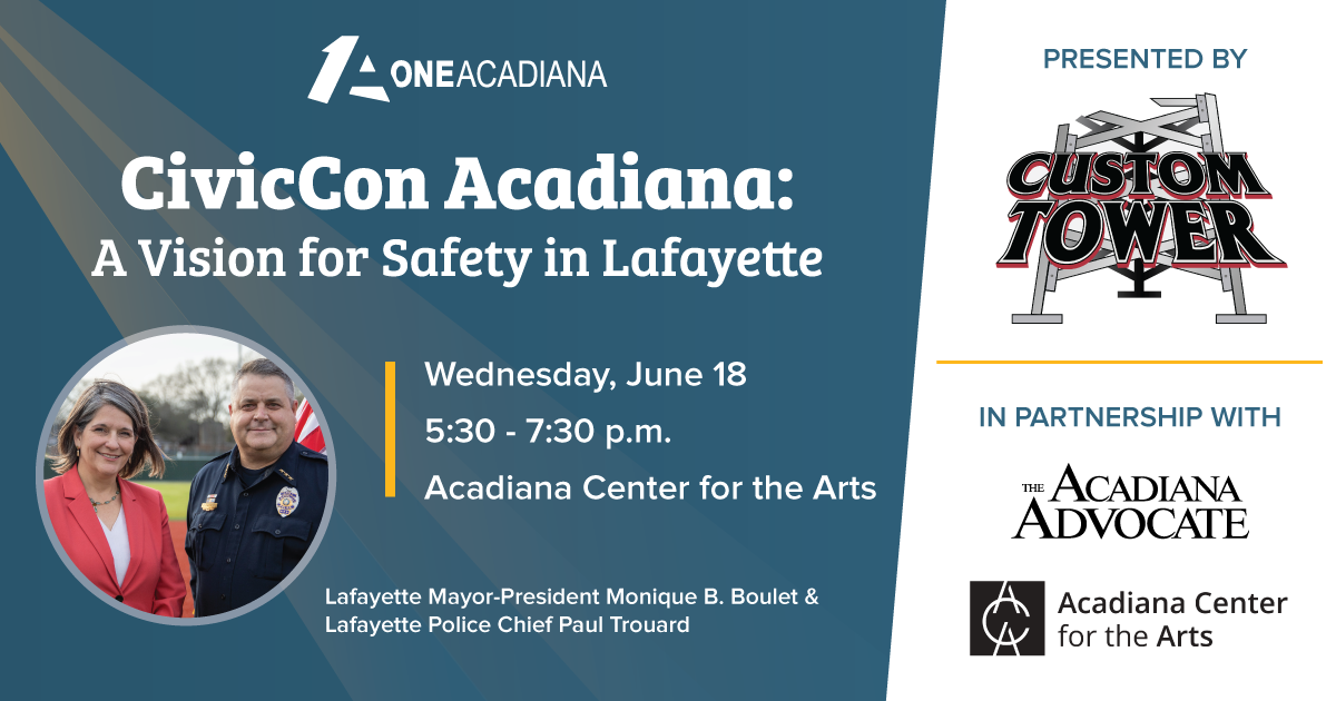Have questions you’d like to ask the Mayor-President or Police Chief? Submit questions prior to the event by emailing One Acadiana Director of Events, Lindsey Faulk, at lindsey@oneacadiana.org.